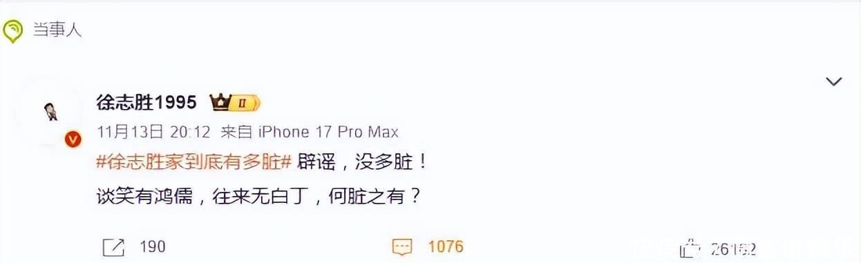 面对好友的调侃和网友们的广泛讨论,徐志胜日通过微博作出了回应。他用一句轻松的“辟谣,没多脏!”来为自己澄清。接着,他引用了古文“谈笑有鸿儒,往来无白丁,何脏之有?”并幽默地补充道:“在家连脏话都不说,大家想想有多干净。”通过这番巧妙的回应,徐志胜不仅避免了与李诞或网友发生尴尬的争辩,还展现了他一贯的幽默与智慧,既圆润又风趣,这种应对方式也得到了网友的高度评价,纷纷称他为“高情商典范”。